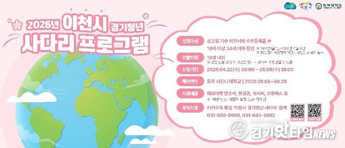 [경기핫타임뉴스=김형철 기자] 이천시는 지역 청년들에게 글로벌 경험을 제공하기 위해 '이천시 경기청년 사다리프로그램(운영기관: 평택대학교 산학협력단)' 2기 참여자를 모집한다고 밝혔다.