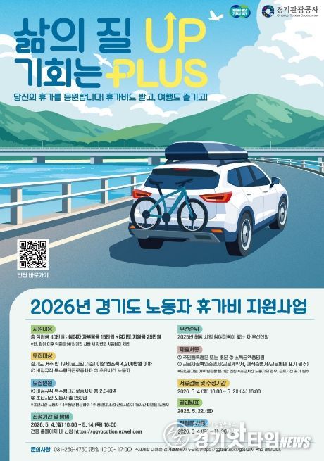 [경기핫타임뉴스=김삼영 기자] 경기도가 경제적 부담으로 휴식을 포기했던 비정규직과 특수형태근로종사자에게 휴가비를 지원하는 ‘취약노동자 휴가비 지원사업’ 참여자를 5월 4일부터 14일까지 모집한다.