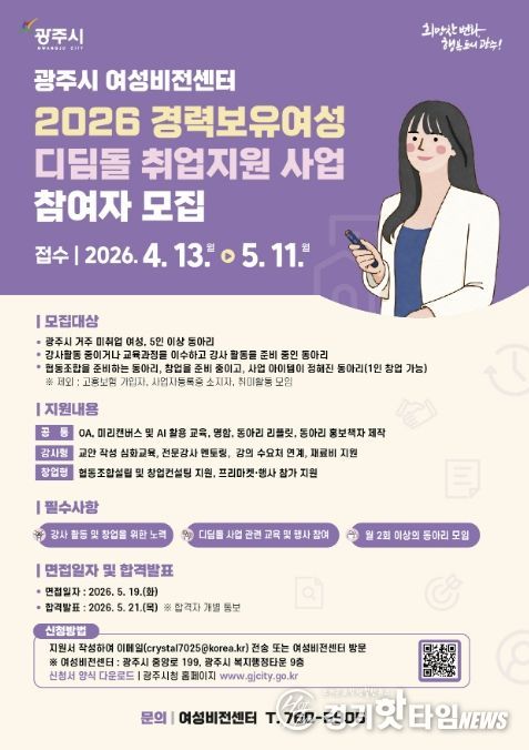[경기핫타임뉴스=김삼영 기자] 광주시는 지역 내 경력보유여성의 사회 재진출과 취업 역량 강화를 위해 ‘2026 경력보유여성 디딤돌 취업 지원 사업’ 참여자를 오는 5월 11일까지 모집한다고 22일 밝혔다.
