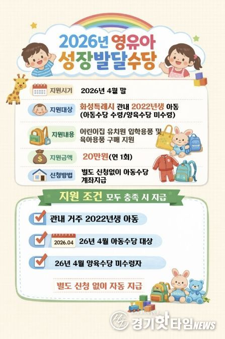 [경기핫타임뉴스=김삼영 기자] 화성특례시는 어린이집 및 유치원 입학 초기 영유아 가정의 양육 부담을 덜고 아동의 건강한 성장을 지원하기 위해 ‘2026년 영유아 성장발달수당’을 지급한다고 밝혔다.