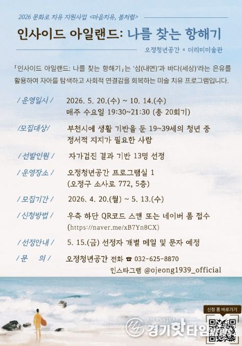 [경기핫타임뉴스=김형철 기자] 부천시는 오정청년공간에서 정서적 고립감을 겪는 청년을 위한 미술 치유 프로그램 ‘인사이드 아일랜드: 나를 찾는 항해기’ 참여자를 5월 13일까지 모집한다.