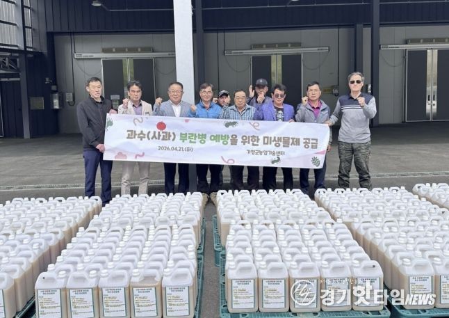 [경기핫타임뉴스=김형철 기자] 가평군농업기술센터가 사과 재배 농가의 고질적인 질병인 부란병 예방을 위해 친환경 미생물제 보급에 나섰다.