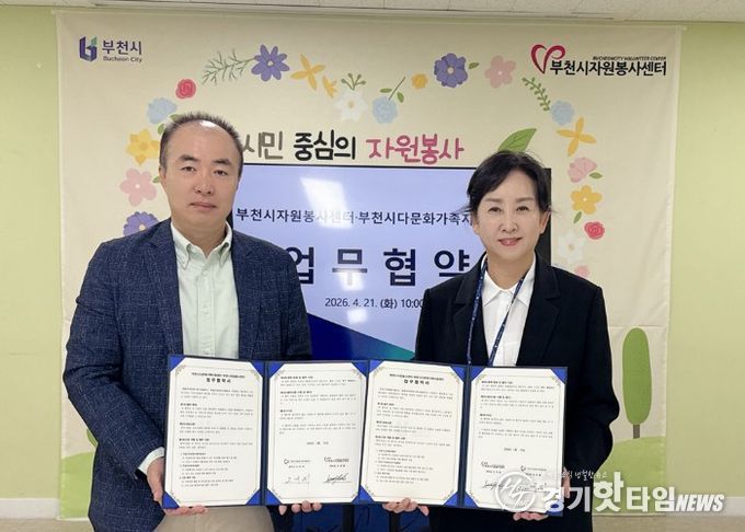 [경기핫타임뉴스=김형철 기자] 부천시다문화가족지원센터는 4월 21일 부천시자원봉사센터와 자원봉사 활성화 및 다문화가족의 지역사회 참여 확대를 위한 업무협약(MOU)을 체결했다고 밝혔다.