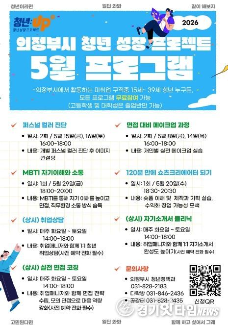 [경기핫타임뉴스=김형철 기자] 의정부시는 미취업 청년의 취업 준비 역량 강화를 위해 ‘청년성장프로젝트’ 5월 프로그램을 운영한다.
