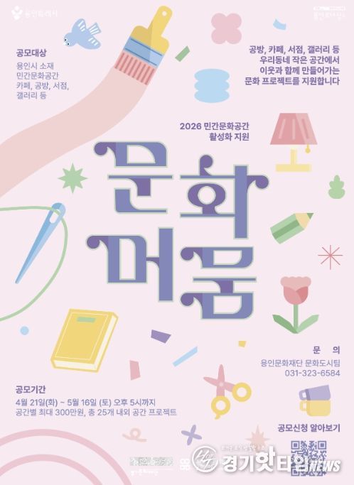 [경기핫타임뉴스=김삼영 기자] 용인문화재단은 오는 5월 16일까지 ‘민간문화공간 활성화 지원사업 '문화머뭄'’의 참여 공간을 모집한다고 밝혔다. 지난해 25개소 공간에서 203회의 프로그램을 운영하며 2,101명의 시민 참여를 이끌어낸 ‘문화머뭄’ 사업은 올해 재단 자체 재원을 매칭하여 총 25개소의 민간문화공간을 선정하고, 공간별 최대 300만 원까지 프로젝트 운영비를 지원할 예정이다.