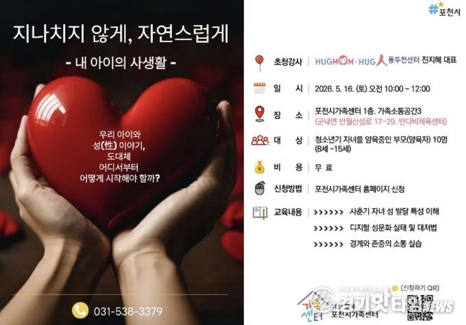 [경기핫타임뉴스=김형철 기자] 포천시 직영 더 큰 행복 포천시가족센터는 오는 21일부터 사춘기 자녀를 둔 양육자를 대상으로 부모 교육 프로그램 ‘지나치지 않게, 자연스럽게’의 참여자를 모집한다. 이번 교육은 5월 16일 오전, 포천시가족센터 가족소통공간(반다비체육센터 1층)에서 대면 강의로 진행된다.