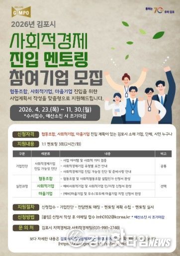 [경기핫타임뉴스=김형철 기자] 김포시는 협동조합, 사회적기업, 마을기업 등 사회적경제기업 진입을 지원하기 위해 ‘2026년 김포시 사회적경제 진입 멘토링’ 참여기업을 오는 11월 30일까지 수시 모집한다.