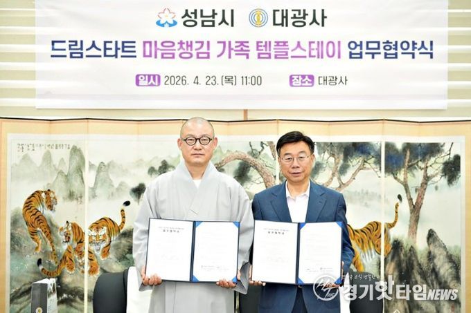 시는 이날 오전 11시 30분 분당구 구미동 불곡산 자락에 있는 대광사 지관전 접견실에서 신상진 성남시장과 도웅 대광사 주지스님 등이 참석한 가운데 ‘드림스타트 가족 마음챙김 템플스테이 추진에 관한 업무협약’을 했다.