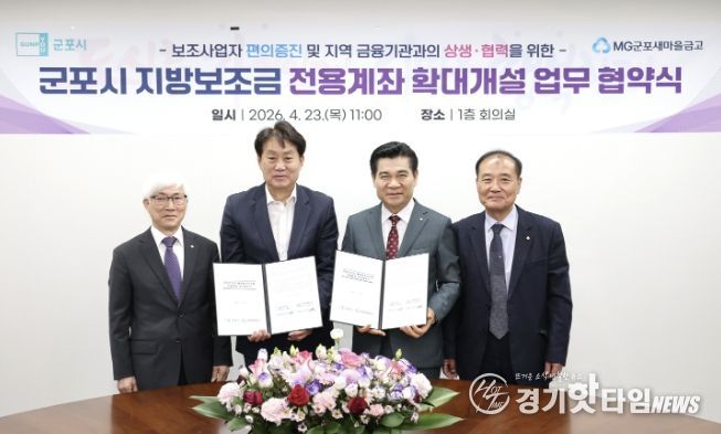 [경기핫타임뉴스=김삼영 기자] 군포시는 지방보조금 전용계좌 개설 금융기관을 기존 시 금고인 NH농협은행에 더해 새마을금고까지 확대하기 위한 업무협약을 23일 체결했다고 밝혔다.