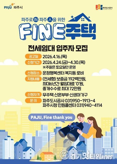 [경기핫타임뉴스=김형철 기자] 파주시는 신혼부부와 신생아 가구의 주거비 부담 완화를 위해 ‘파인(FINE)주택’전세임대 입주자 신청을 24일부터 받는다.