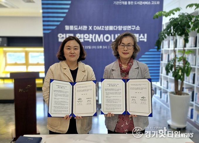 [경기핫타임뉴스=김형철 기자] 파주시 월롱도서관은 지난 22일 디엠지(DMZ)생물다양성연구소와 지역사회 독서진흥 및 생태환경 분야 협력을 위한 업무협약을 체결했다.