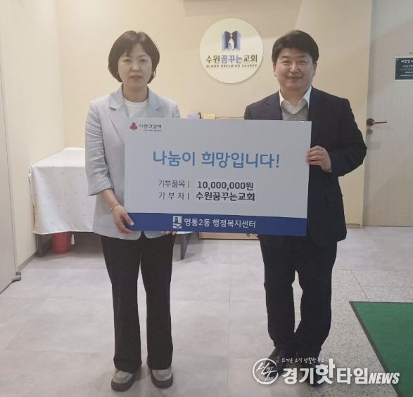 [경기핫타임뉴스=김삼영 기자] 수원시 영통구 영통2동은 지난 23일 수원꿈꾸는교회가 지역사회 내 취약계층 지원을 위해 교인들과 함께 모금한 사랑의 성금 1천만원을 영통2동 행정복지센터에 기부했다고 밝혔다.