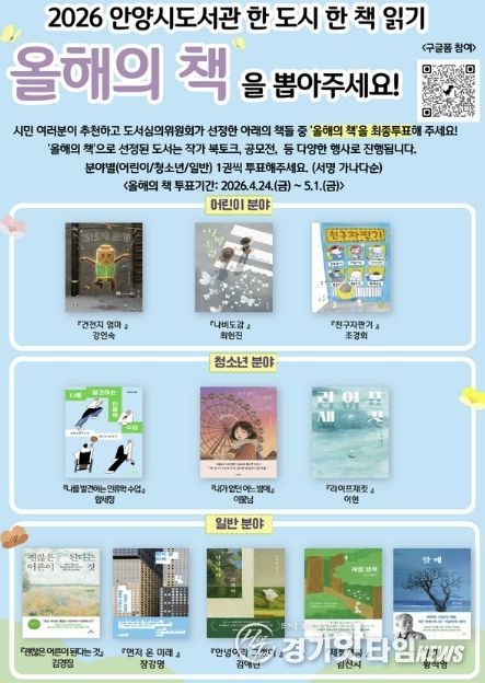 [경기핫타임뉴스=김삼영 기자] 안양시는 2026년 한 도시 한 책 읽기 ‘올해의 책’ 선정을 위한 시민 선호도 조사를 오는 5월 1일까지 온·오프라인으로 진행한다고 24일 밝혔다.