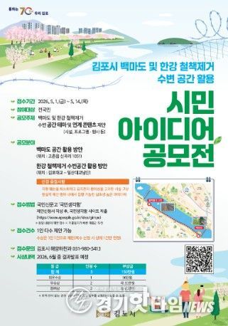 [경기핫타임뉴스=김형철 기자] 김포시가 한강 철책 제거 부지와 백마도 등 천혜의 수변 자원을 시민들의 쉼터와 문화 공간으로 탈바꿈하기 위해 ‘시민 아이디어 공모전’을 개최한다고 밝혔다. 이번 공모전은 ‘김포시 백마도 및 한강 철책 제거 수변 공간 활용’을 주제로, 시민들의 창의적이고 실효성 있는 아이디어를 발굴해 시정 운영에 적극 반영하기 위해 마련됐다.