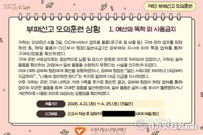 [경기핫타임뉴스=김삼영 기자] 수원시청소년청년재단은 임직원의 부패 상황 인지 및 신고 역량을 강화하고 조직 내 청렴문화를 확산하기 위해 '2026년 부패신고 모의훈련'을 실시했다고 밝혔다.