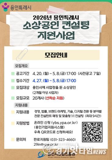 [경기핫타임뉴스=김삼영 기자] 용인특례시와 용인시산업진흥원은 ‘2026년 용인시 소상공인 창업 및 경영 컨설팅 지원사업’에 참여할 소상공인을 모집한다고 26일 밝혔다.