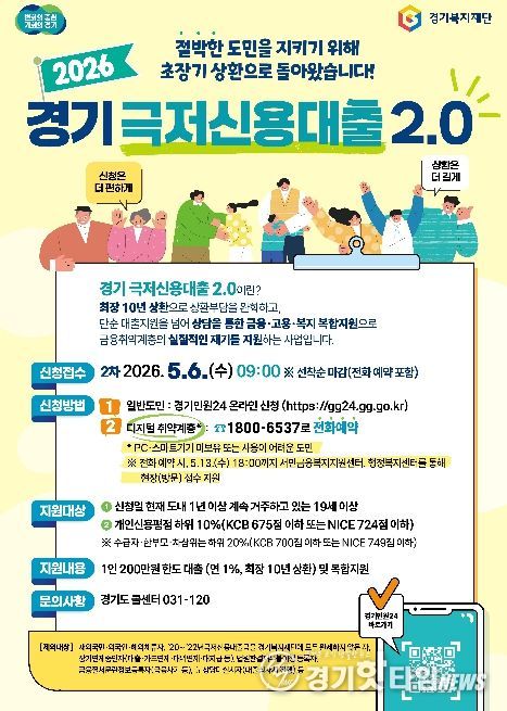 [경기핫타임뉴스=김삼영 기자] 경기도가 5월 6일 오전 9시부터 금융취약계층의 생활 안정을 지원하는 ‘경기 극저신용대출 2.0’ 2차 접수를 시작한다.