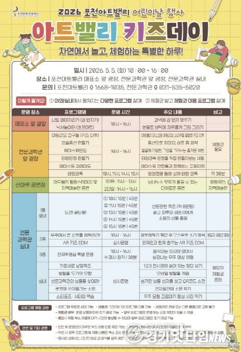 [경기핫타임뉴스=김형철 기자] 포천문화관광재단이 운영하는 포천아트밸리는 오는 5월 5일 어린이날을 맞아 어린이와 가족을 위한 체험형 문화행사 ‘아트밸리 키즈데이’를 개최한다.
