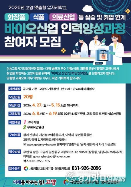 [경기핫타임뉴스=김형철 기자] 고양특례시는 2026년 고양맞춤형 일자리학교 공모사업 중 ‘바이오산업 인력 양성과정’의 참여자를 모집한다.