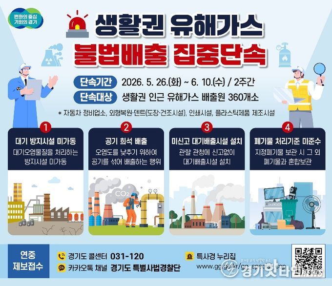 [경기핫타임뉴스=김삼영 기자] 경기도 특별사법경찰단이 5월 26일부터 6월 10일까지 2주간 주거지·학교·병원 등 생활권 인근 지역의 유해가스 배출 사업장을 대상으로 불법행위를 집중단속 한다.