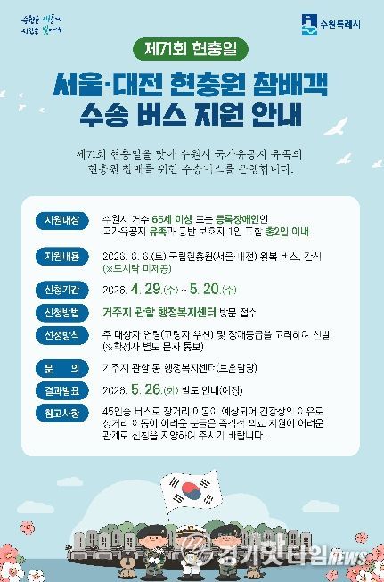 [경기핫타임뉴스=김삼영 기자] 수원특례시가 제71회 현충일인 6월 6일, 국립현충원(서울·대전)까지 이동이 여의치 않은 국가유공자 유족을 위해 현충원 왕복 수송버스를 운행한다.