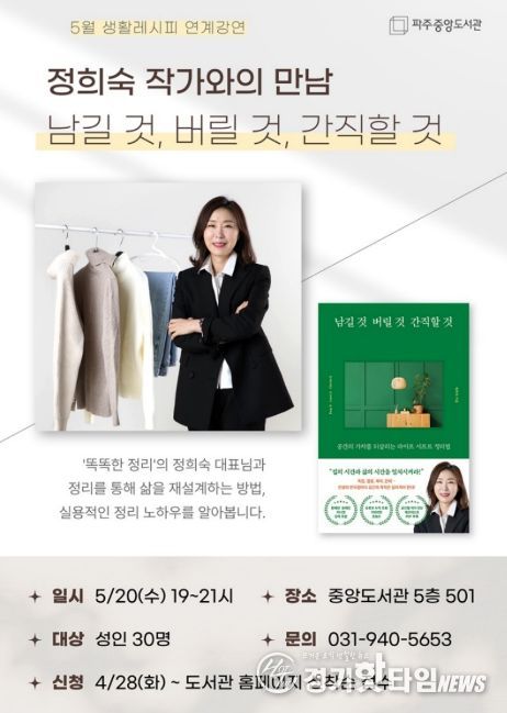 [경기핫타임뉴스=김형철 기자] 파주시 중앙도서관은 오는 5월 20일 19시, 정리 전문가 정희숙 작가를 초청한 '남길 것, 버릴 것, 간직할 것' 강연을 개최한다.