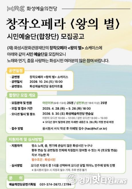 [경기핫타임뉴스=김삼영 기자] (재)화성시문화관광재단은 오는 10월 개최 예정인 창작오페라 '왕의 별' 쇼케이스 무대에 참여할 시민합창단을 모집한다.