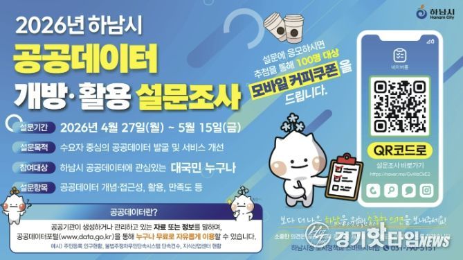 [경기핫타임뉴스=김형철 기자] 하남시는 시민과 기업, 연구기관 등 다양한 수요자의 의견을 반영해 공공데이터 개방 및 활용을 확대하고자 ‘2026년 하남시 공공데이터 설문조사’를 실시한다고 밝혔다.