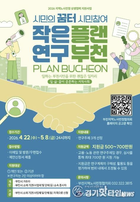 [경기핫타임뉴스=김형철 기자] 부천시는 부천지역노사민정협의회가 지역 노사민정 상생협력 지원사업의 일환으로 시민참여형 연구 공모사업 ‘플랜부천(Plan Bucheon)’을 추진한다고 28일 밝혔다.