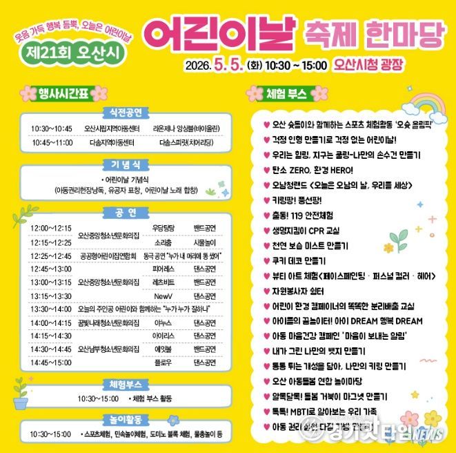 [경기핫타임뉴스=김삼영 기자] 오산시는 오는 5월 5일 어린이날을 맞아 오산시청 광장에서 ‘제21회 오산시 어린이날 축제 한마당’을 개최한다고 밝혔다.