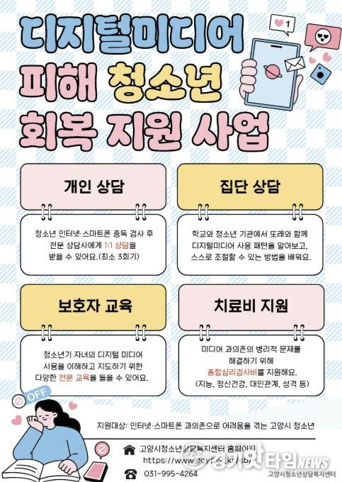 [경기핫타임뉴스=김형철 기자] 고양시청소년재단 산하 고양시청소년상담복지센터는 디지털 유해환경에 의한 청소년의 디지털 과의존 및 사이버 도박 등의 사회문제를 예방하고 치료하기 위해 오는 5월부터 12월까지 ‘디지털미디어 피해 청소년 회복 지원 사업’을 운영한다고 밝혔다.