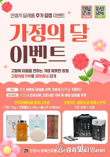 [경기핫타임뉴스=김삼영 기자] 안성시는 오이데이와 5월 가정의 달을 맞아 고향사랑기부제 참여 확대와 지역 농산물 소비 촉진을 위해 ‘오이데이 이벤트’와 ‘가정의 달 이벤트’를 추진한다고 밝혔다.
