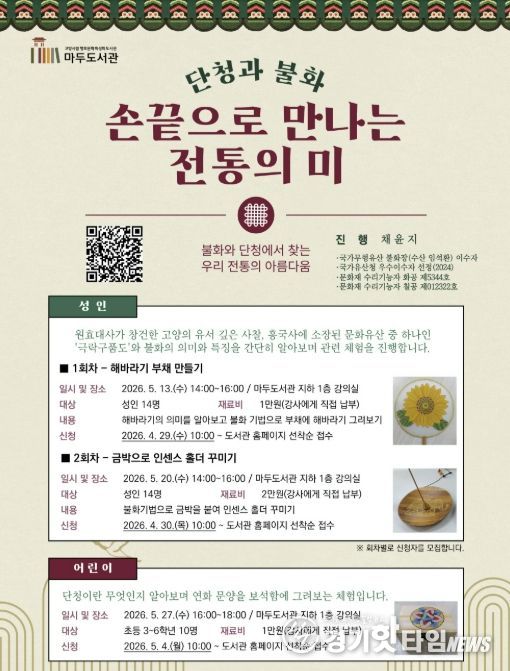 [경기핫타임뉴스=김형철 기자] 고양특례시 마두도서관은 오는 5월, 단청과 불화를 주제로 우리 전통의 아름다움을 체험할 수 있는 프로그램 ‘손끝으로 만나는 전통의 미’를 운영한다.