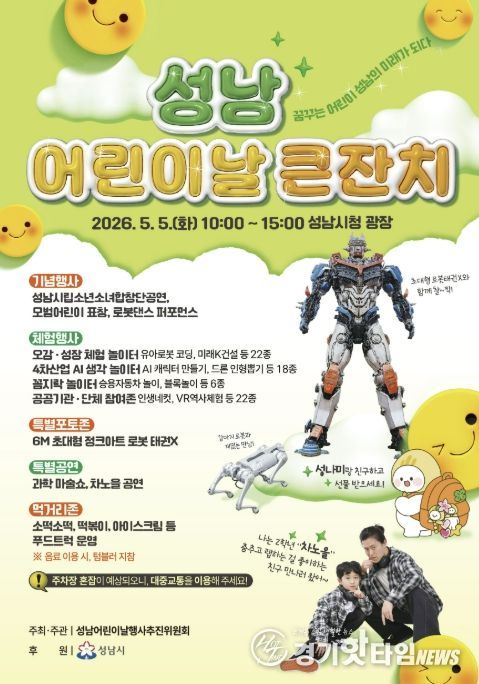 [경기핫타임뉴스=김삼영 기자] 성남시는 오는 5월 5일 시청 광장과 1층 온누리에서 ‘어린이날 큰잔치’를 개최한다.