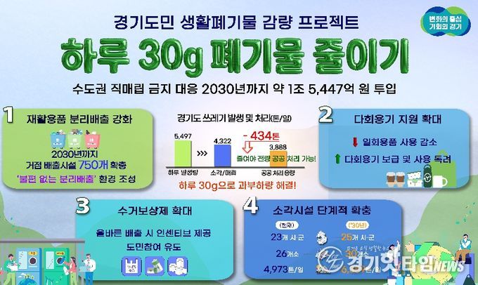[경기핫타임뉴스=김삼영 기자] 수도권 직매립 금지에 따른 생활쓰레기 감량을 위해 경기도가 2030년까지 5년간 약 1조 5,447억 원을 투입하는 ‘하루 30g, 도민실천형 생활폐기물 감량 프로젝트’를 추진한다.