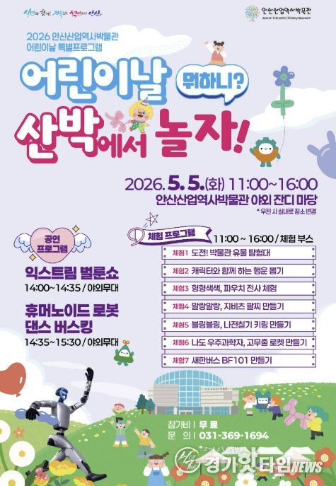 [경기핫타임뉴스=김삼영 기자] 안산시는 내달 5일 어린이날을 맞아 안산산업역사박물관에서 어린이날 특별프로그램 ‘어린이날 뭐하니? 산박에서 놀자!’를 개최한다고 29일 밝혔다.