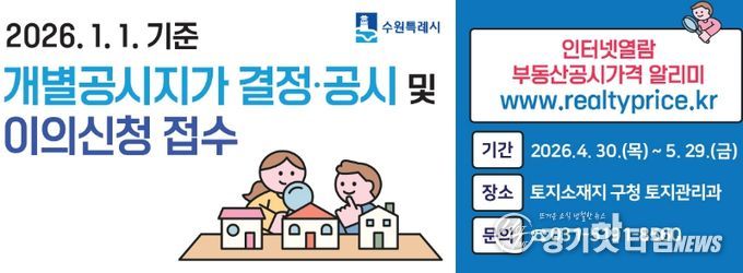 [경기핫타임뉴스=김삼영 기자] 수원시 영통구는 2026년 1월 1일 기준 개별공시지가를 4월 30일 결정·공시하고, 5월 29일까지 이의신청 기간을 운영한다.
