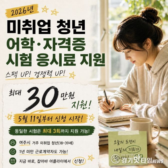 [경기핫타임뉴스=김형철 기자] 여주시는 오는 5월 11일부터 미취업 청년에 어학·자격시험 응시료를 지원하는 ‘경기청년 역량강화 기회지원’ 사업 접수를 시작한다.