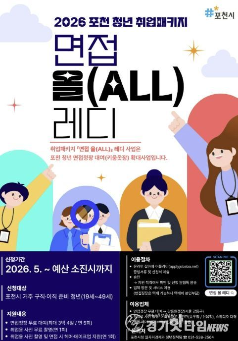 [경기핫타임뉴스=김형철 기자] 포천시는 구직 및 이직을 준비하는 청년들의 취업 준비 부담을 낮추고 취업 경쟁력을 높이기 위해 오는 5월 2일부터 2026 포천 청년 취업패키지 ‘면접 올(ALL) 레디’ 사업을 운영한다.
