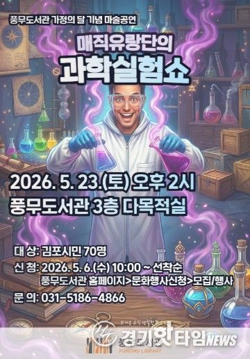 [경기핫타임뉴스=김형철 기자] 김포시 풍무도서관에서는 5월 23일 오후 2시부터 3시까지 마술공연 ‘매직유랑단의 과학실험쇼’를 운영한다. 가정의 달을 맞아 도서관 이용 가족에게 특별한 문화 향유 기회를 제공하고자 기획된 공연이다.