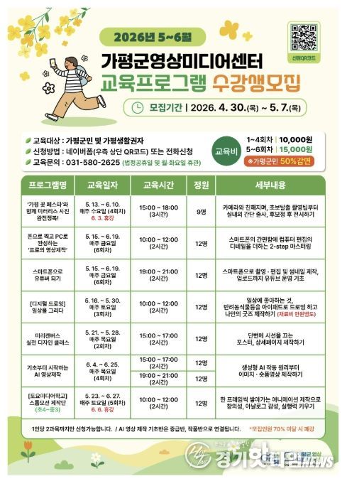 [경기핫타임뉴스=김형철 기자] 가평군영상미디어센터가 군민들의 영상 미디어 콘텐츠 역량 강화를 위해 ‘5~6월 미디어 교육 프로그램’ 수강생을 4월 30일부터 선착순으로 모집한다.