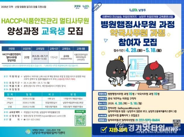[경기핫타임뉴스=김형철 기자] 남양주시는 ‘2026년 지역·산업맞춤형 일자리 창출 사업’의 일환으로 취업연계형 직업훈련 3개 과정 참여자를 모집한다고 29일 밝혔다.