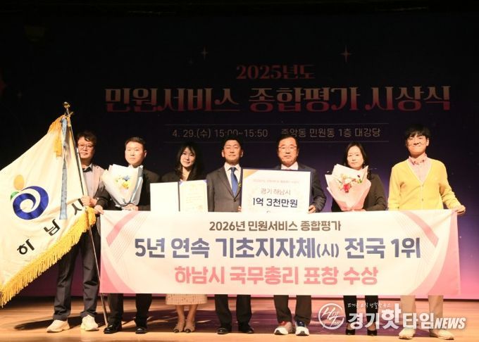 [경기핫타임뉴스=김형철 기자] 하남시가 전국 기초자치단체 중 최고 수준의 민원서비스 역량을 인정받으며 5년 연속 최우수 기관으로 선정됐다. 하남시는 29일 정부세종청사에서 열린 ‘2025년 민원서비스 종합평가’ 우수기관 시상식에서 국무총리 표창을 수상했다고 밝혔다.