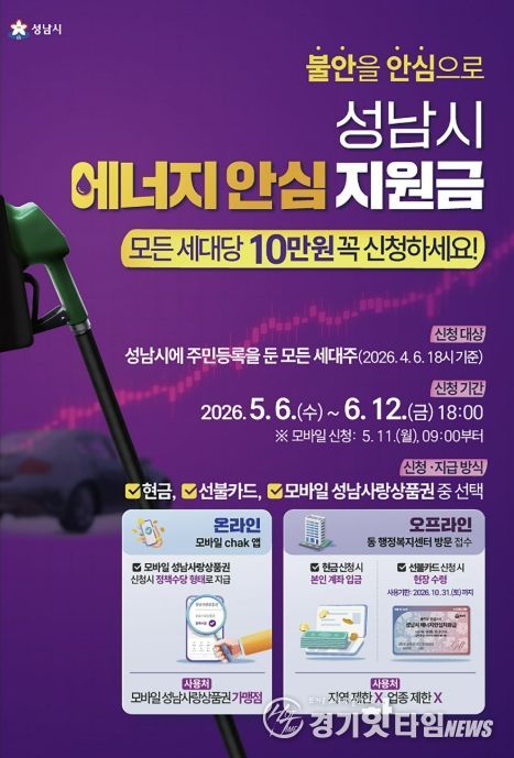 [경기핫타임뉴스=김삼영 기자] 성남시는 중동 사태에 따른 국가 자원안보 위기 경보 발령으로 경제적 부담이 커진 시민들을 지원하기 위해 전국 최초로 ‘성남시 에너지 안심지원금’을 오는 5월 6일부터 신청을 받는다고 밝혔다.