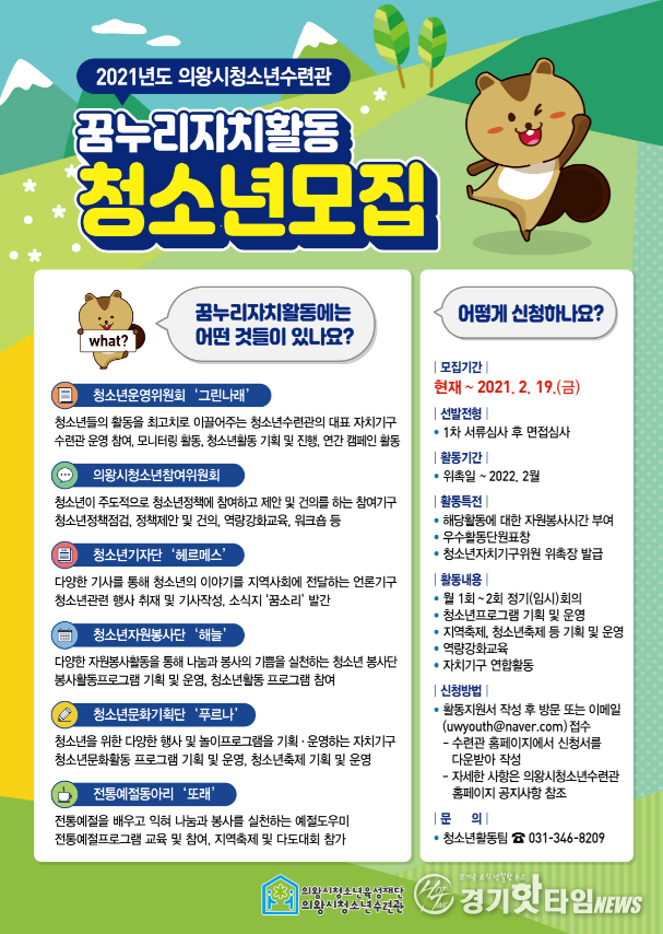 [경기핫타임뉴스=김삼영 기자] 의왕시청소년수련관은 청소년들의 참여활동을 최대치로 이끌어 올리는 꿈누리 자치기구 청소년을 모집한다.