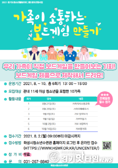 [경기핫타임뉴스=김삼영 기자] 화성시청소년수련관(화성시여성가족청소년재단 운영)은 8월 2일부터 ‘가족이 소통하는 보드게임 만들기’ 프로그램 참가자를 모집한다. 2021년 경기도청소년공모사업에 선정된 ‘가보만들기’는 가족이 소통하며 보드게임을 만드는 활동으로 화목한 시간을 함께할 수 있는 가족 참여프로그램이다.