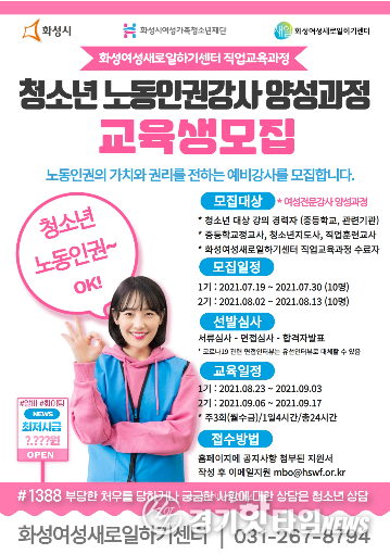 [경기핫타임뉴스=김삼영 기자] 화성여성새로일하기센터은 오는 8월 2일부터 13일까지 ‘청소년 노동인권 강사 양성 과정’ 교육생을 모집한다. 대상은 청소년 대상 강의 경력자, 중등학교 정교사, 청소년지도사, 직업훈련교사, 여성새일센터 직업교육과정 수료자 등으로 서류 및 면접 심사를 거쳐 총 10명을 선발한다.