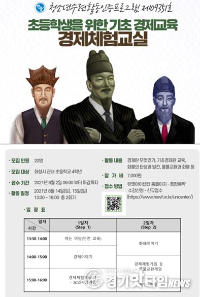 [경기핫타임뉴스=김삼영 기자] 화성시청소년수련관(화성시여성가족청소년재단 운영)은 오는 8월 2일부터 초등학생을 대상으로 한 기초 경제교육 프로그램 ‘경제체험교실’ 참가자를 선착순 모집한다.