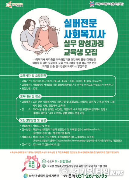 [경기핫타임뉴스=김삼영 기자] 화성여성새로일하기센터(화성시여성가족청소년재단 운영)는 8월 2일부터 20일까지 ‘실버전문 사회복지사 실무 양성과정’ 교육생을 모집한다. 현 고령화 사회에 노인복지시설의 증가 및 실버전문사회복지사 구직에 대한 높은 수요 등을 반영해 개설된 교육과정이다.