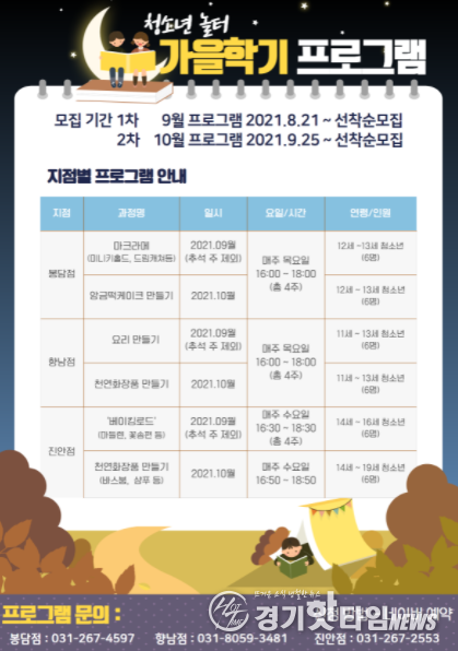 청소년놀터의 여가‧문화 프로그램은 9월 1일을 시작으로 두 달 동안 각 개소별(진안점·봉담점·향남점) 총 8회 진행하며, 프로그램 시간은 진안점(9월 16:30~18:30/ 10월 16:50~18:50)과 봉담점·향남점(16:00~18:00/ 9·10월 동일)이 다르다. 총 24회로 진행되는 프로그램이며, 참가비는 무료이다.